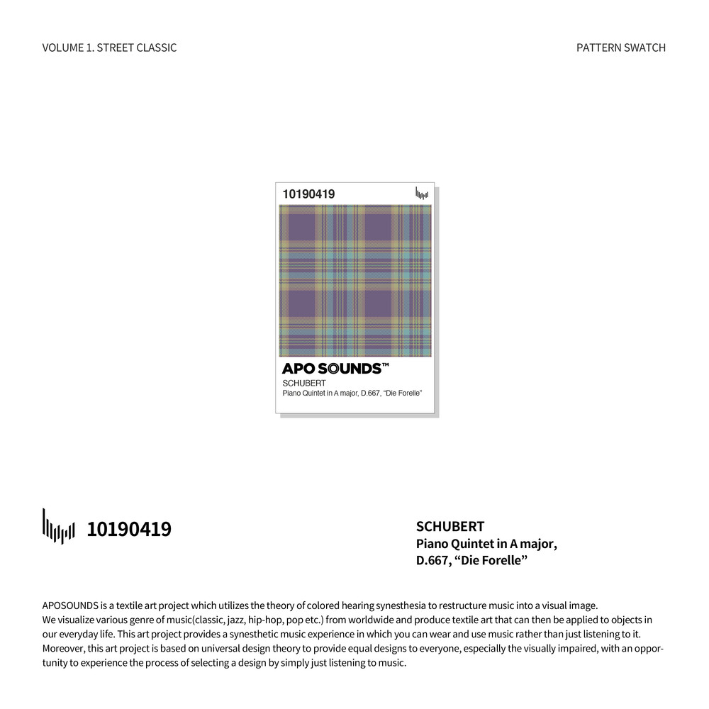 가곡의 왕이라 불리는 오스트리아 작곡가 Franz Peter Schubert의 Piano Quintet in A Major D. 667 작품은 1819년 여행에서 만난 음악 애호가인 Silvester Paumgartner의 의뢰로 만들어진 5개의 악장으로 구성된 작품으로 그의 사후 1년 뒤인 1829년에야 출판되었다. 본 작품은 특이하게 일반적인 피아노 5중주의 악기 편성이 아닌 피아노, 바이올린, 비올라, 첼로, 더블베이스로 이루어져 있다. 분석된 주제는 '송어' (Die Forelle)라는 부제를 갖게 한 자작의 가곡 '송어'의 변주곡 형식인 제4악장 (Andantino - Allegretto)의 Thema로 현악기로만 연주되며, 바이올린이 '송어'의 주제를 제시한다.